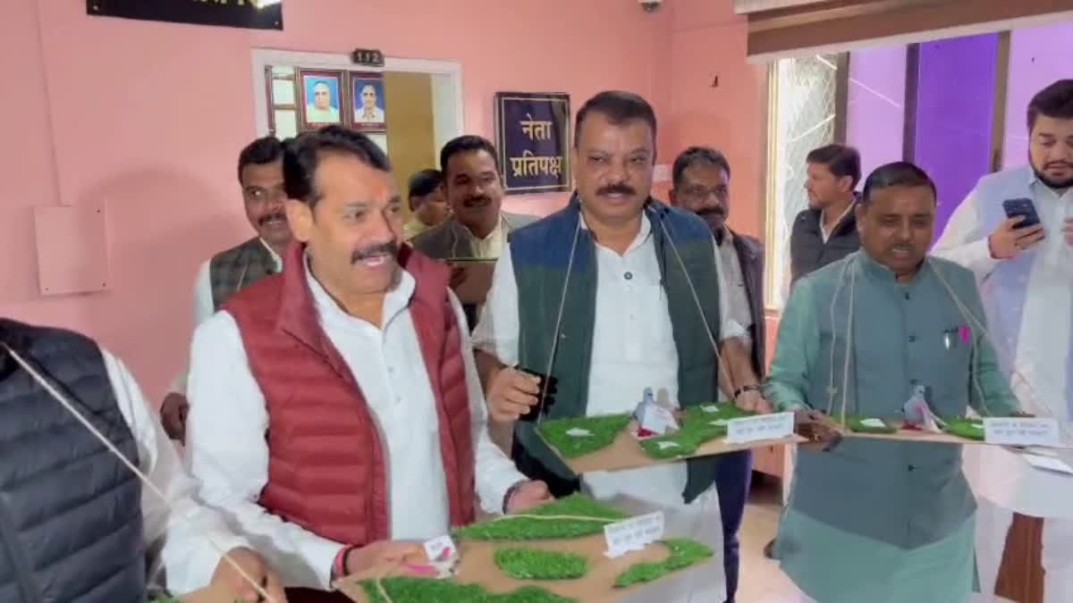 कांग्रेस अपनी मांगों को लेकर ध्यान खींचने विरोध का अलग-अलग तरीका अपना रही है. एक दिन पहले कांग्रेस विधायकों ने स्वास्थ्य व्यवस्था को लेकर अनोखा विरोध प्रदर्शन किया था. सदन के दूसरे दिन कांग्रेस विधायक चिड़िया चुग गई खेत की झांकी लेकर पहुंचे. इसमें कांग्रेस ने दिखाया कि बीजेपी रूपी चिड़िया किसान का अनाज चुग रही है और इससे किसान के हाथ खाली रह गए हैं. कांग्रेस विधायकों ने गांधी प्रतिमा के सामने सरकार के खिलाफ नारेबाजी की.